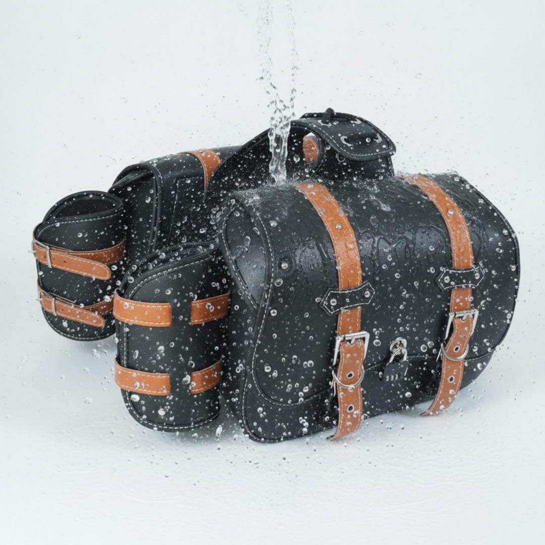 Yes! These motorcycle saddle bags are crafted from premium PU leather that offers excellent water resistance, keeping your belongings safe from rain, splashes, and road dust.