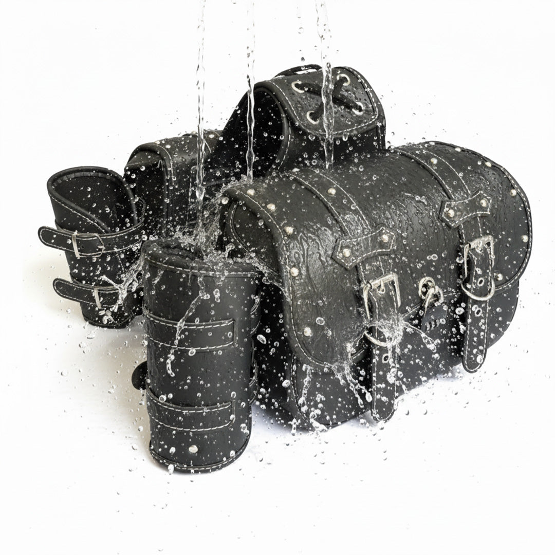 Yes! These motorcycle saddle bags are crafted from premium PU leather that offers excellent water resistance, keeping your belongings safe from rain, splashes, and road dust.