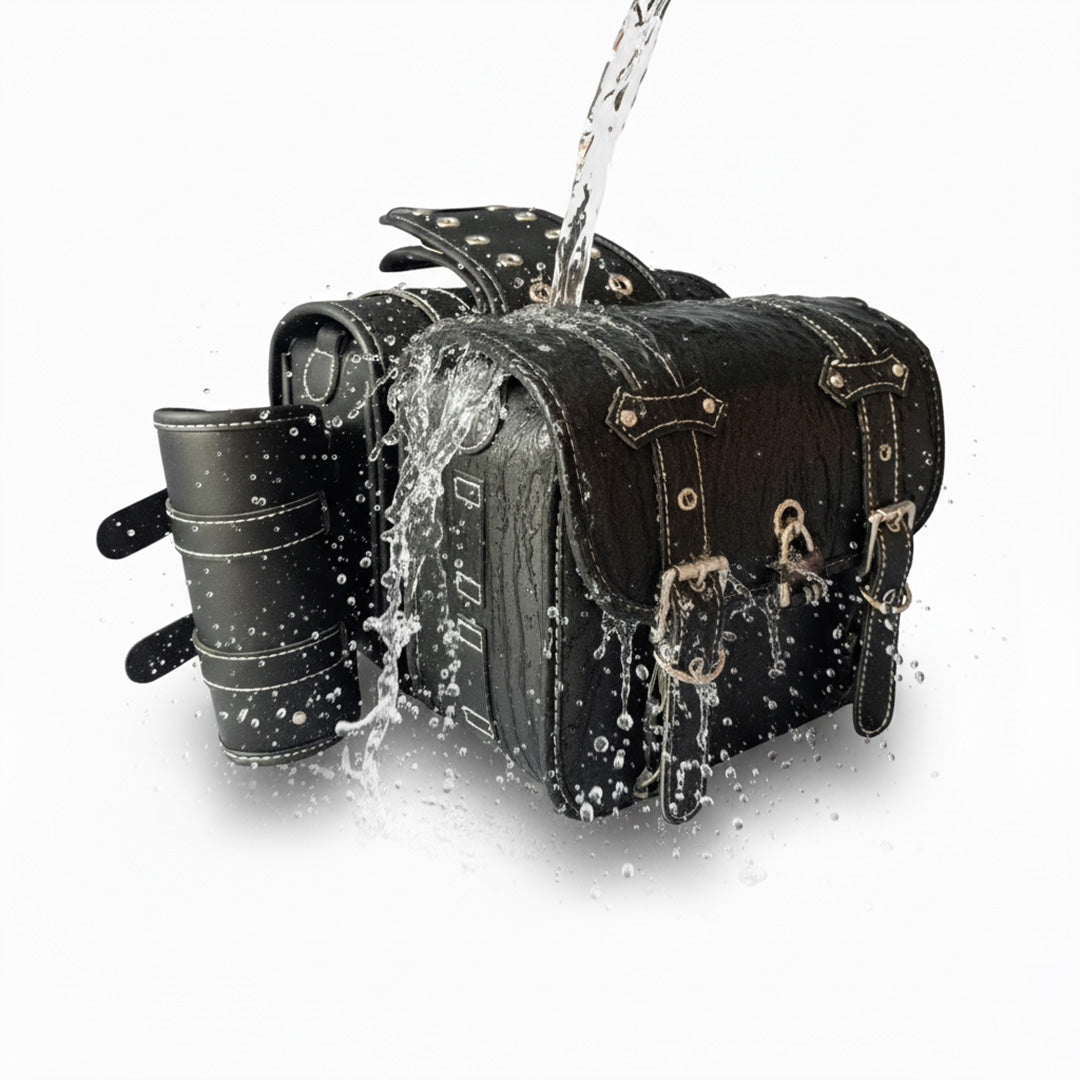 Yes! These motorcycle saddle bags are crafted from premium PU leather that offers excellent water resistance, keeping your belongings safe from rain, splashes, and road dust.